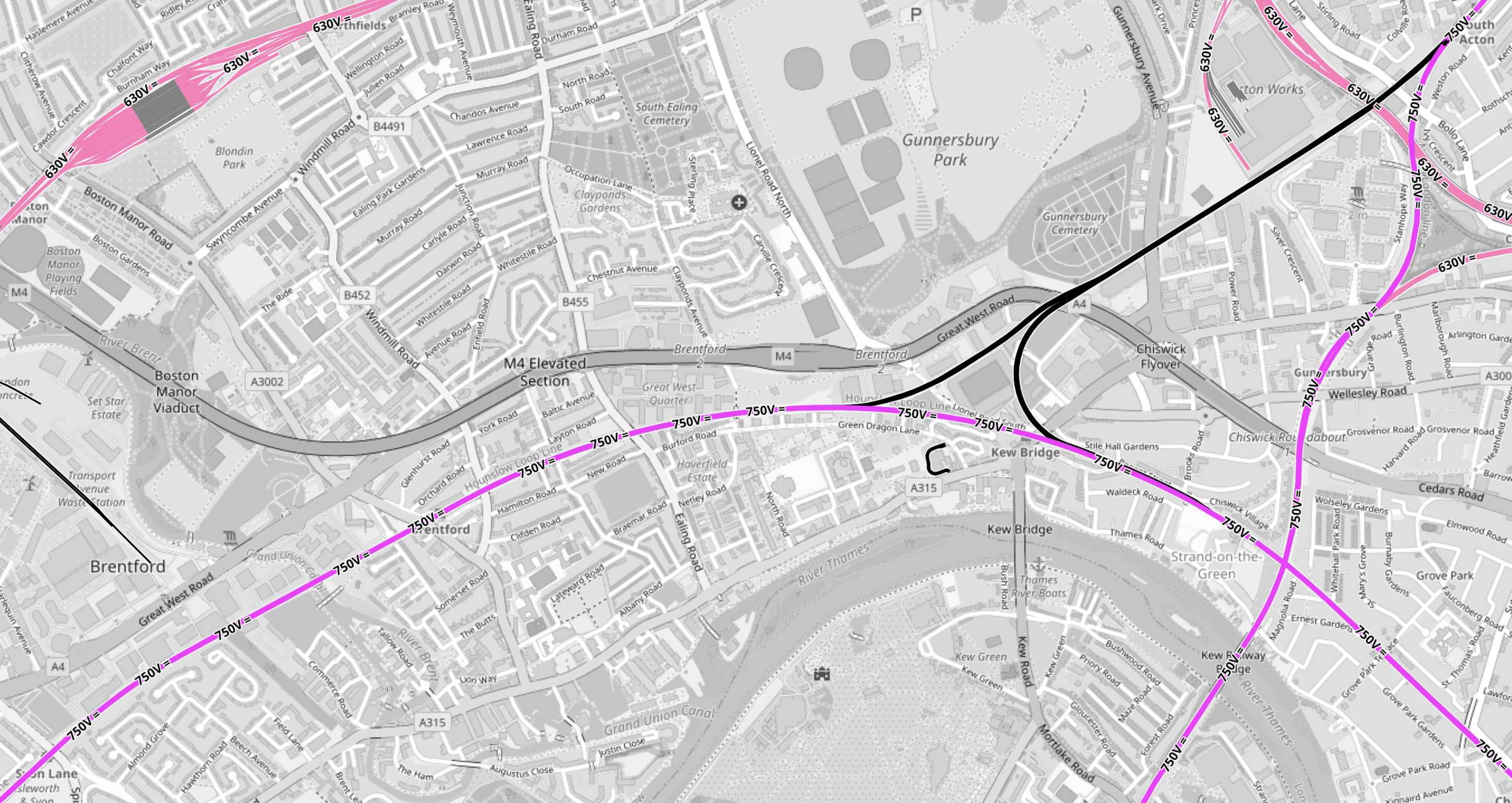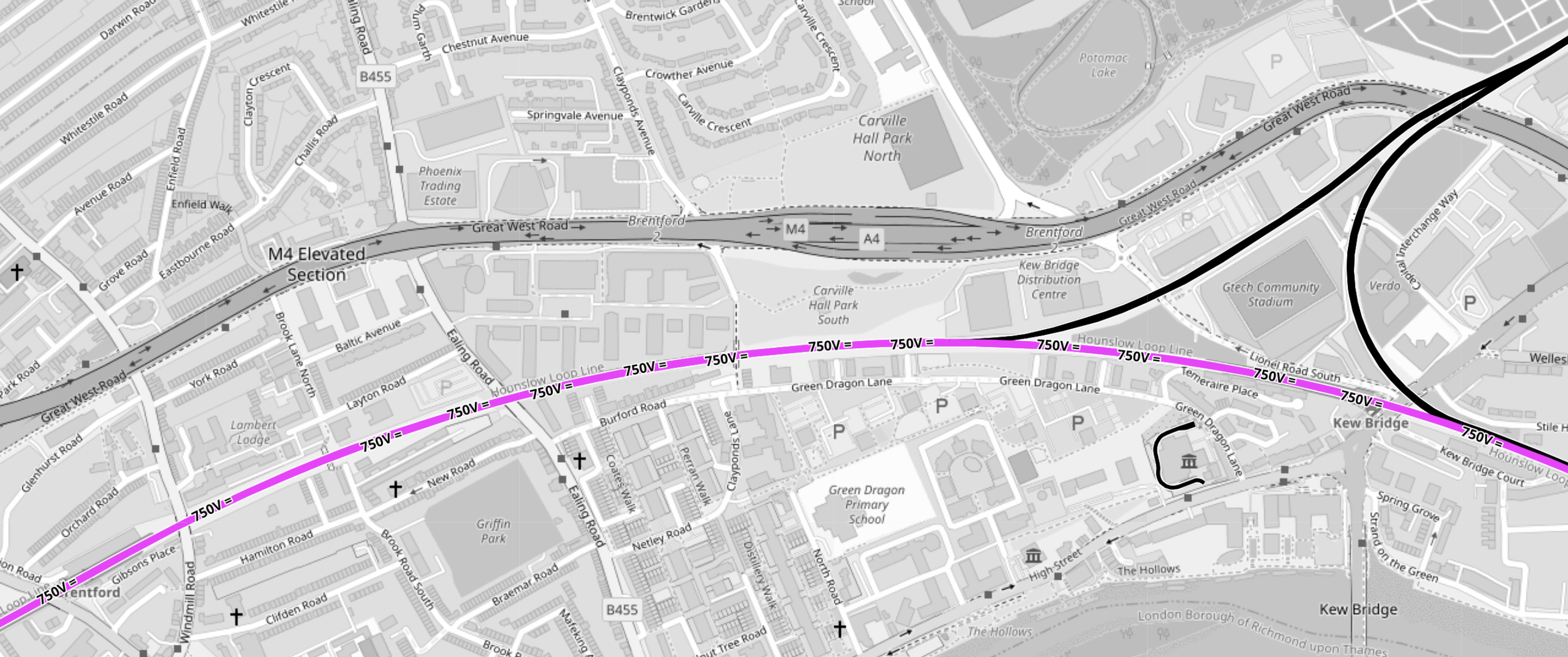 - The lilac track crossing the map is the electrified Hounslow Loop Line.