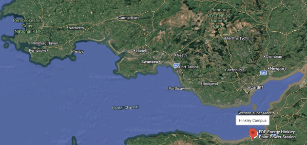 This Google Map shows the Bristol Channel from the wind farms in the West to Cardiff and Hinkley Point.
