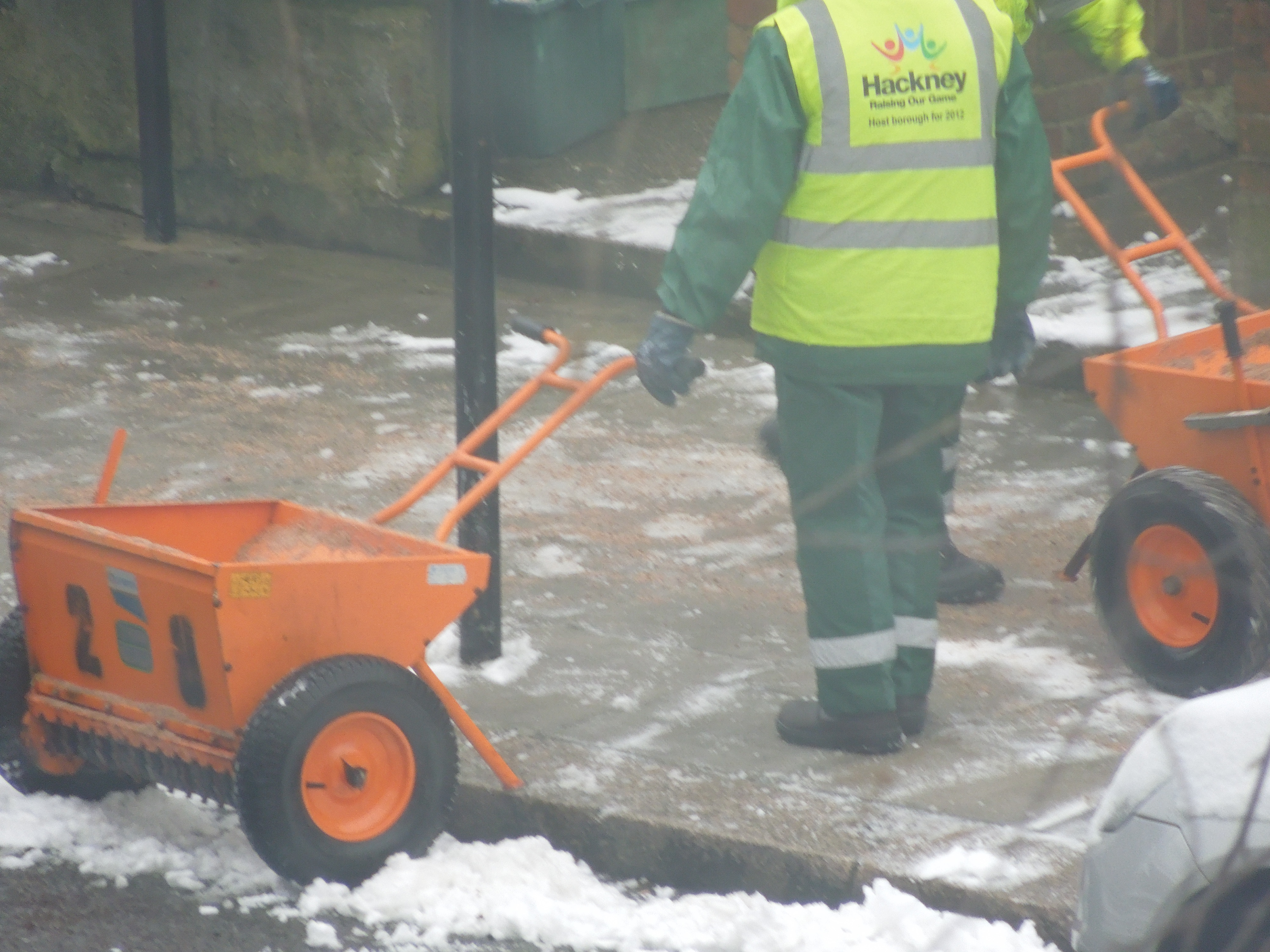 I’ve just walked down the road to get my paper and on the other side of the road, three workers from Hackney Council are clearing the pavement. They have a rather nifty pair of grit spreaders!