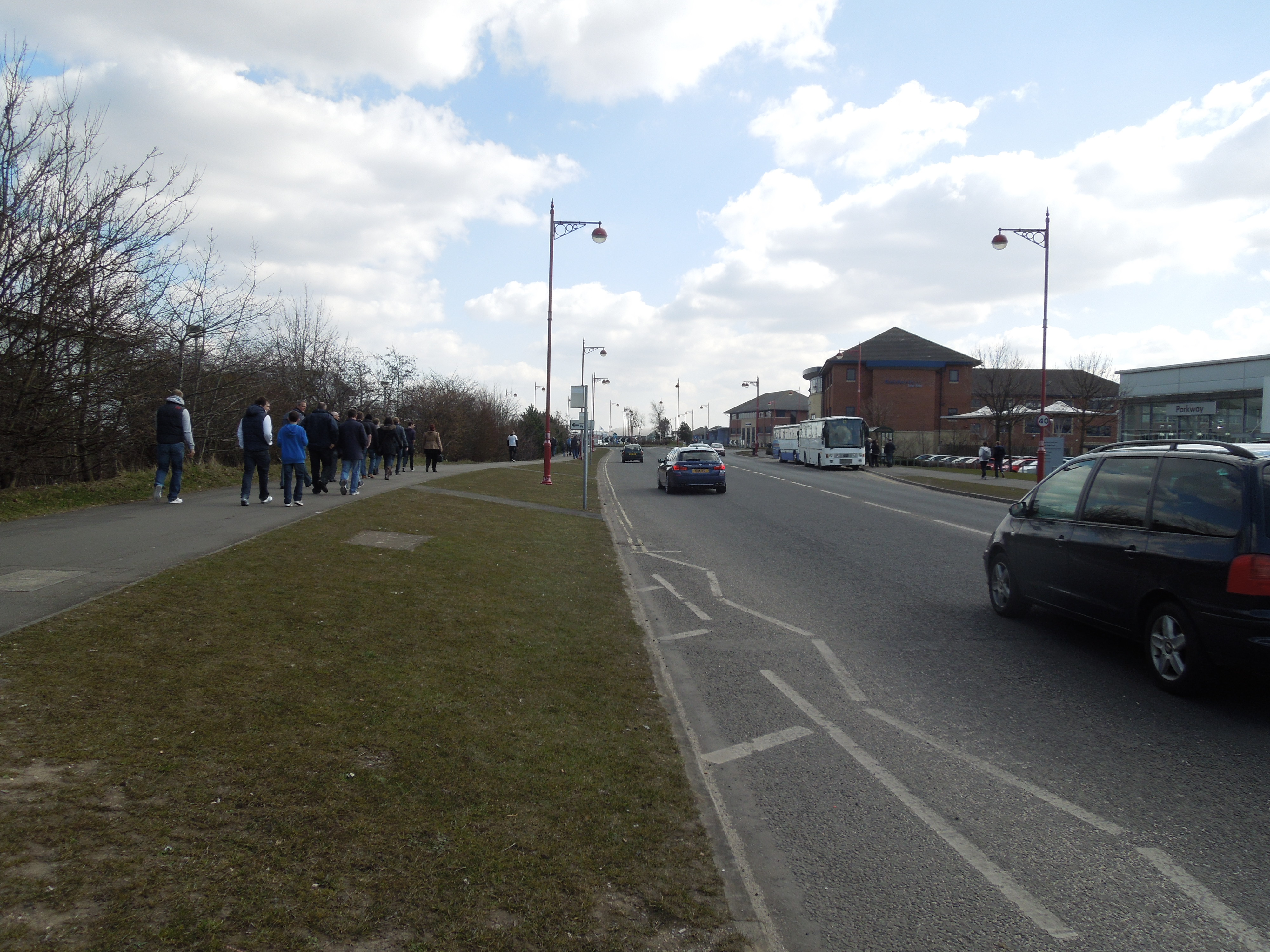 You walk through, an office park to the ground and it is all pretty easy going. Although a map or two and some more finger posts would be a good idea. For the first time this year, we saw a ground bathed in sunshine.