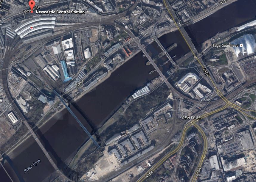 Newcastle station is a station that I don’t remember as anything special from my last visit some yeas ago, although it is a Grade I Listed Building. But since then, several millions have been spent according to Wikipedia, mainly on internal and retail facilities and on opening up the area round the station. So perhaps I should pay the city a visit. This Google Earth image shows the unique position of the station.