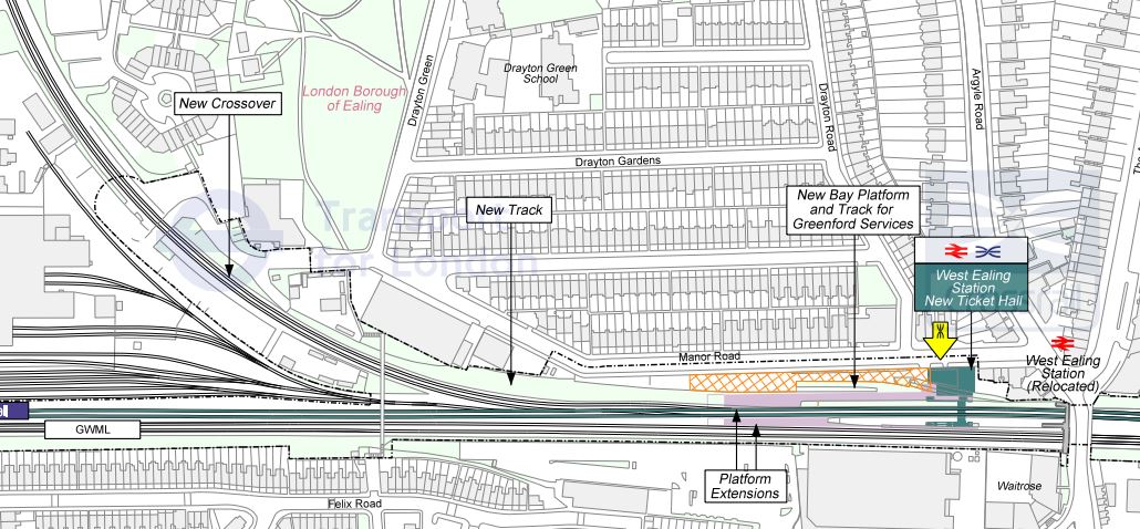 Note the Greenford Branch curving away to the North. This branch is probably an operational headache for rail managers, as the trains currently have to join the line to get to their terminus at Paddington station. After West Ealing station has been rebuilt, there will be a bay platform for trains on the branch. It is shown in this drawing I found on the Internet.