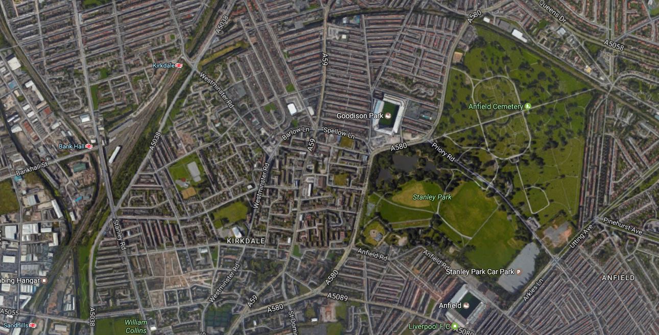 The station at the bottom left is Sandhills station, with Merseyrail’s Kirkdale depot to the North.