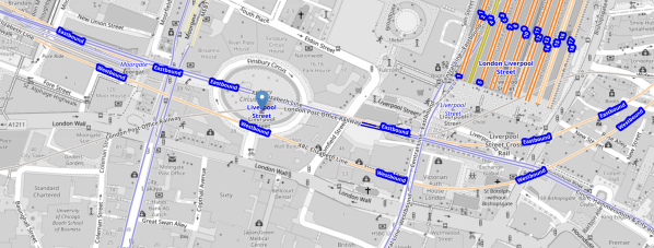 - The Central Line is shown in blue and crosses between Finsbury Square and Liverpool Street station on its way to Bank.