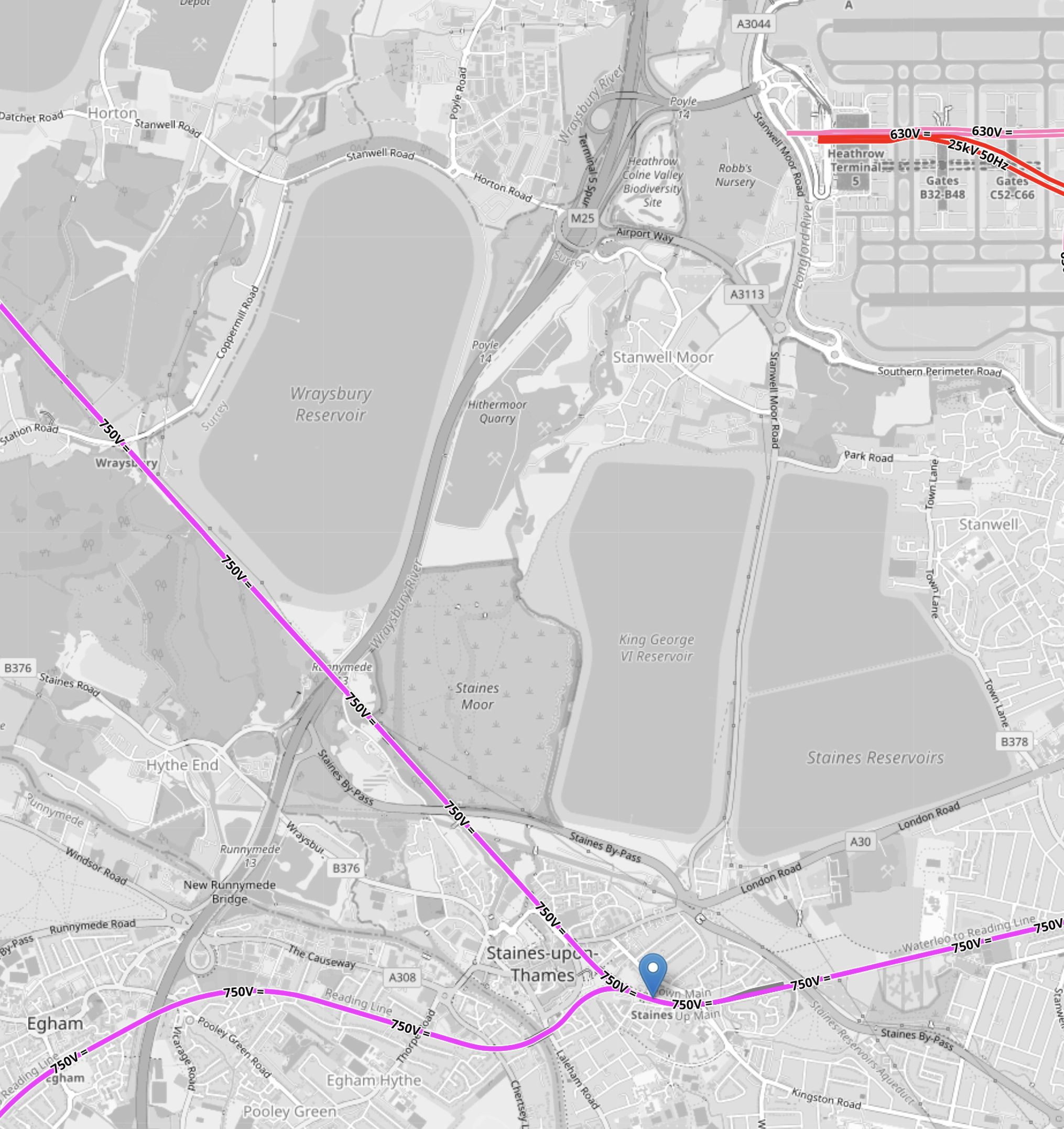 Staines Station and Heathrow Airport are not far apart, as this OpenRailwayMap shows.