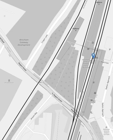 This OpenRailwayMap shows the platform layout at Wrexham General station.