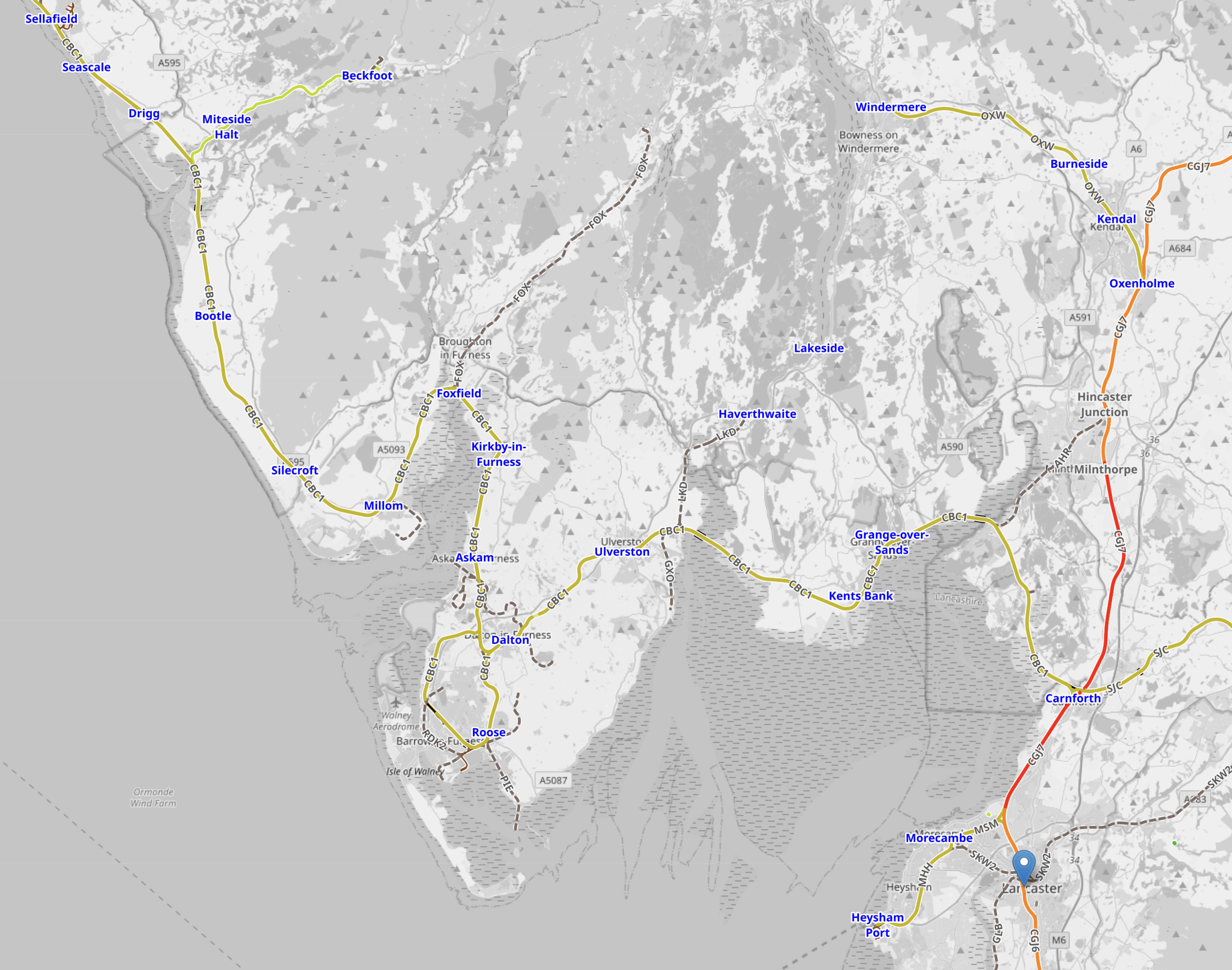 This OpenRailwayMap shows the railway network around Lancaster.