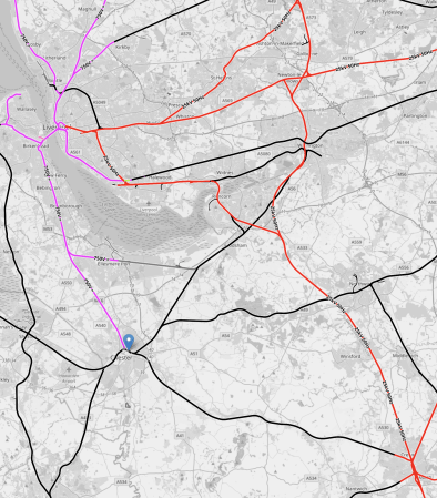 - The red tracks are electrified with 25 KVAC overhead and connect Liverpool to Manchester in the East and Crewe in the South-East corner of the map.
