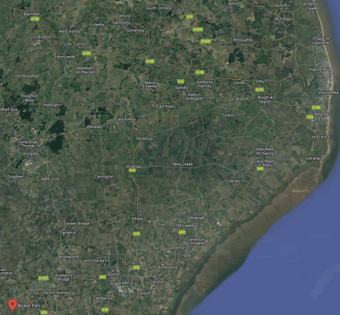 This Google Map, shows the location of Bicker Fen, about halfway between Boston and Sleaford.