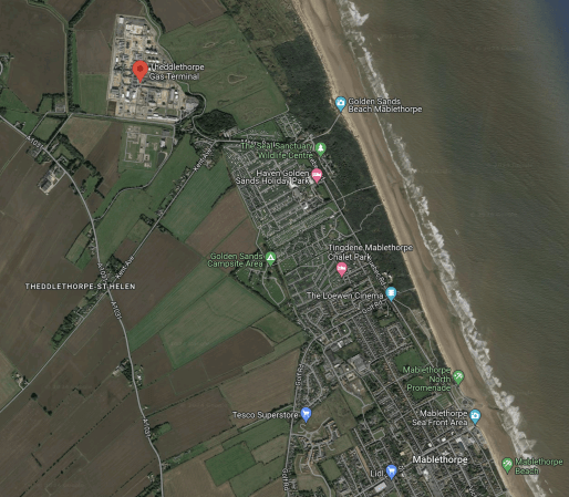 - The decommissioned Theddlethorpe gas terminal is indicated by the red arrow.