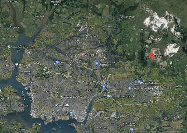 The red arrow indicates the Hemerdon Tungsten Mine, which has a Wikipedia entry as Drakelands Mine, where this is said about the last three years.