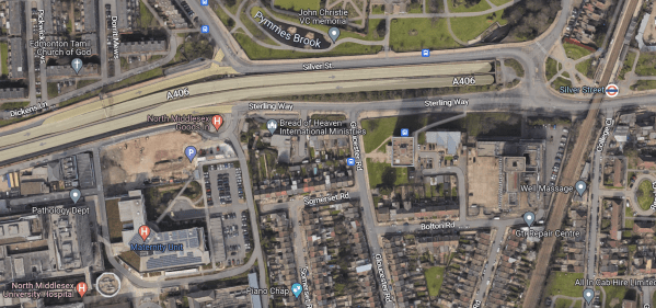 - The North Middlesex University Hospital in the South-West corner of the map.