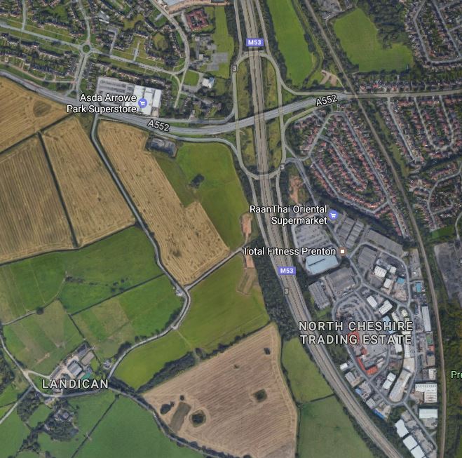Note how, the Motorway and the Borderlands Line go either side of the North Cheshire Trading Estate.