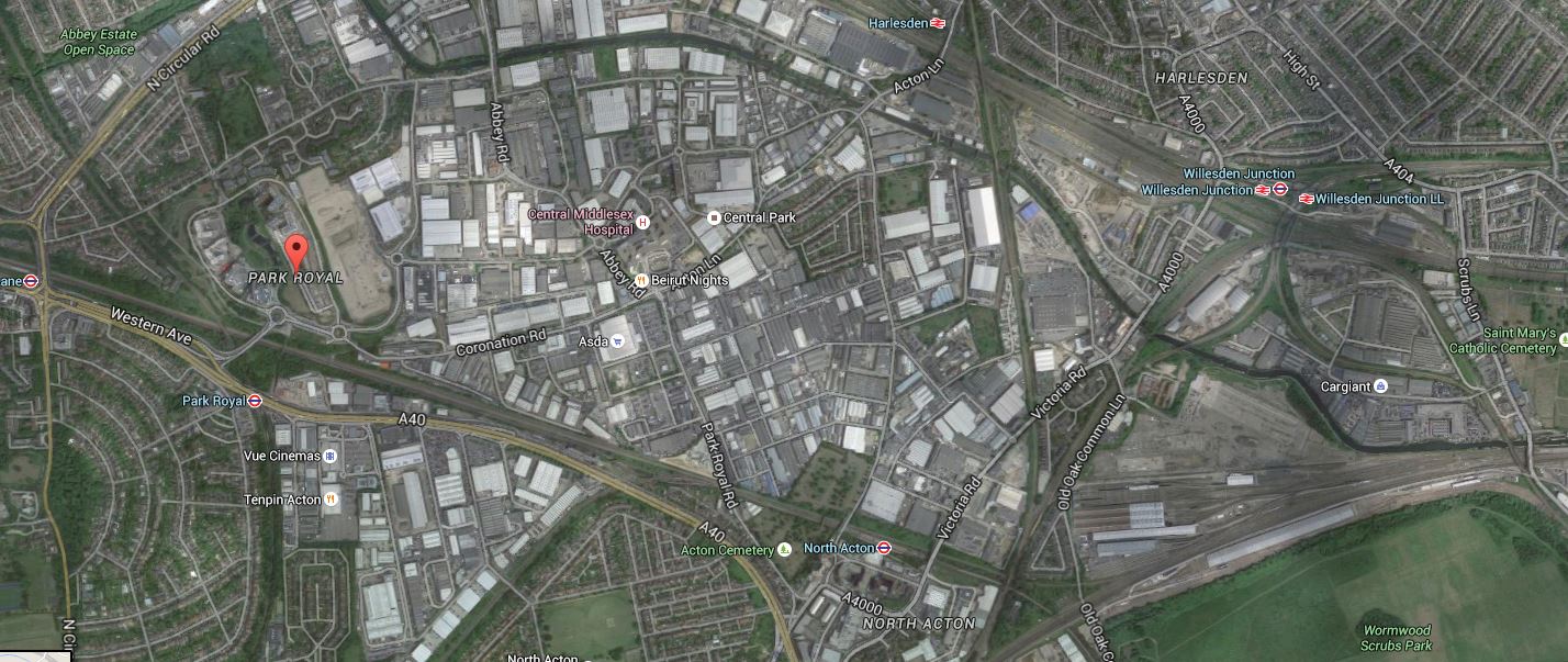 - The red arrow points at Park Royal, which at 500 hectares, is the largest business park in London.