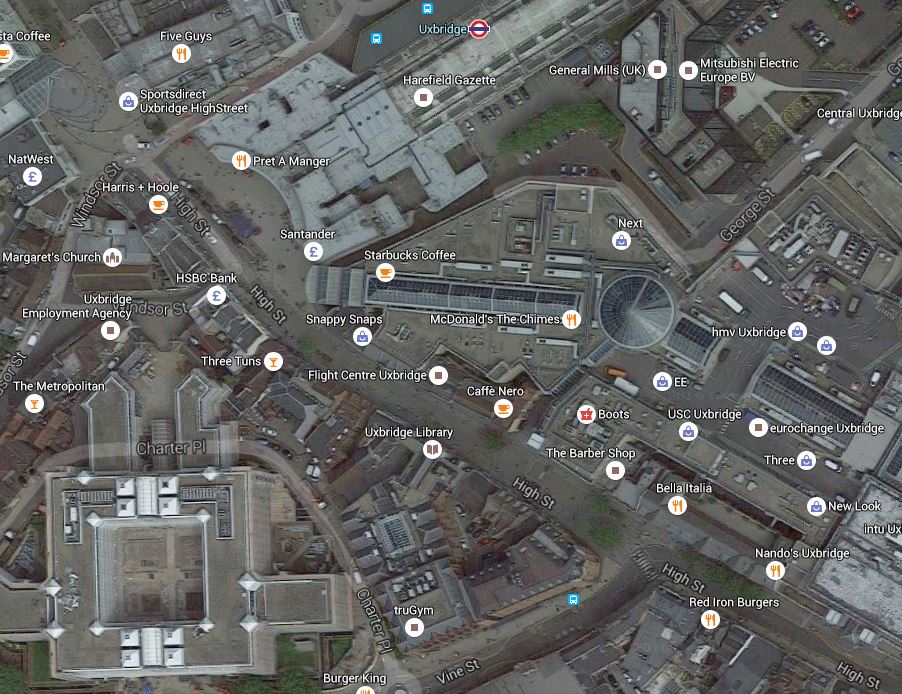 This is a Google Map of Uxbridge Town Centre.