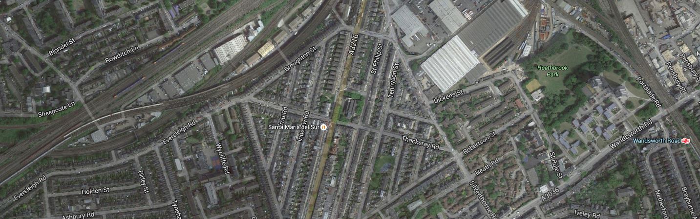 Note Wandsworth Road station at the East of the map, with Clapham Junction station, off the map a short distance to the West.