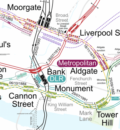 - Crossrail is shown in purple.