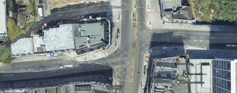 - On the South side of Dalston Lane is Dalston Junction station, with a West-facing bus-stop in front.