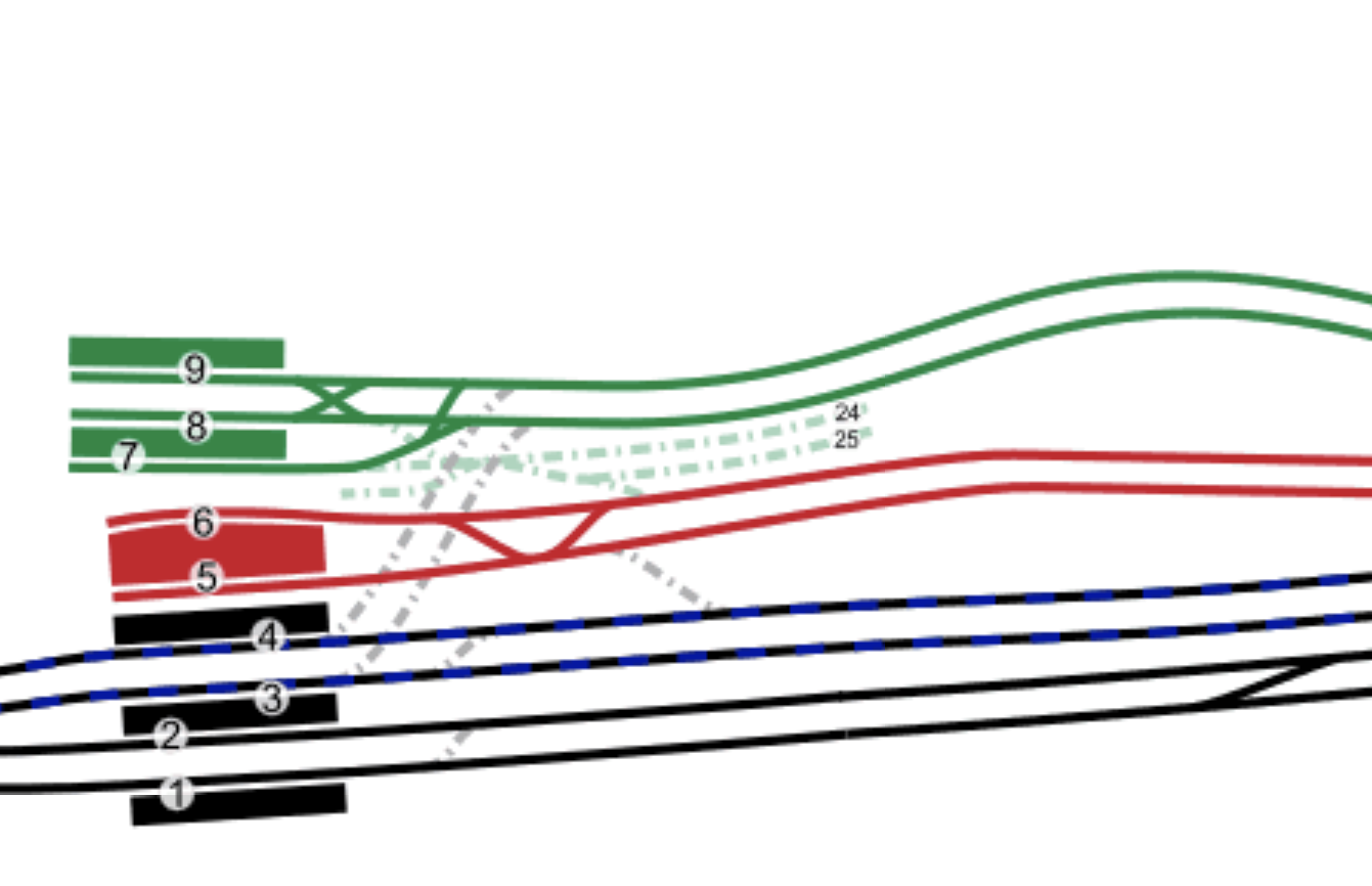 - The lines shown in black are the fast lines through platforms 2 and 1, which carry all fast services. Platform 2 is the London-bound platform.