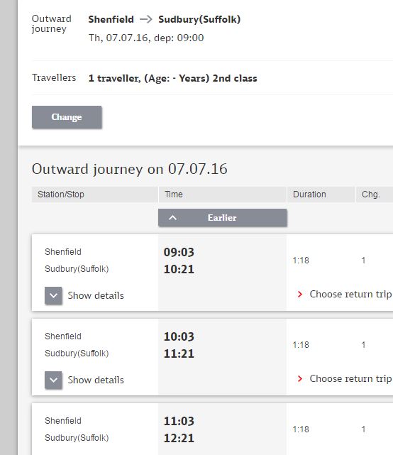 I want to go to Sudbury today, so to find the times of the trains, I tried to look them from Shenfield to Sudbury on the National Rail web site.