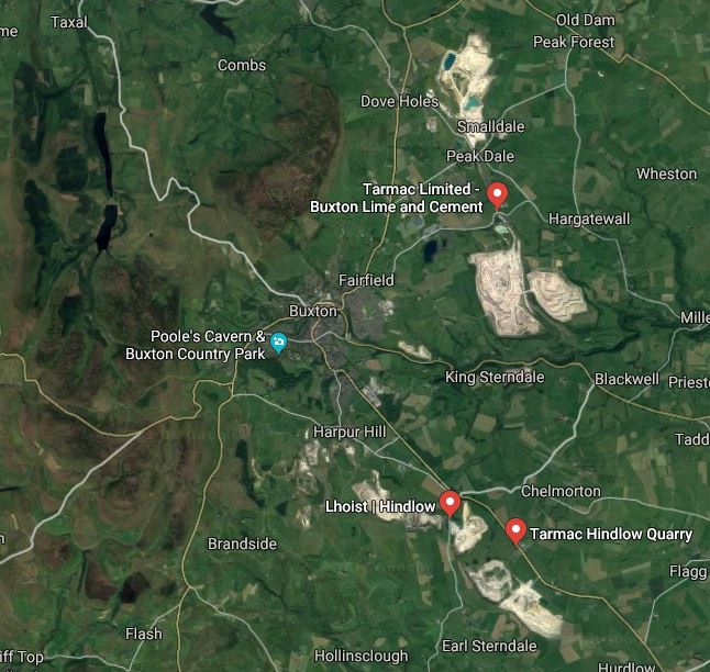 This Google Map shows the quarries surrounding the town of Buxton.