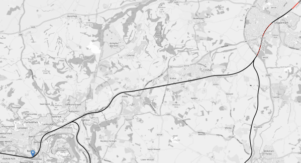 This OpenRailwayMap shows the electrification between Chippenham and Bath Spa stations.