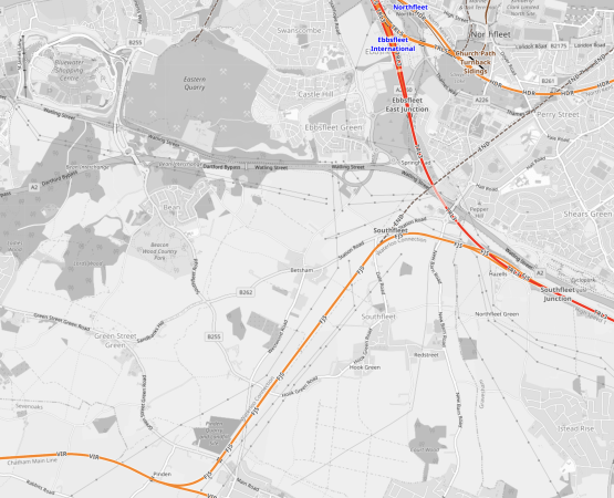 This OpenRailwayMap shows the location of Northfleet and Ebbsfleet stations.