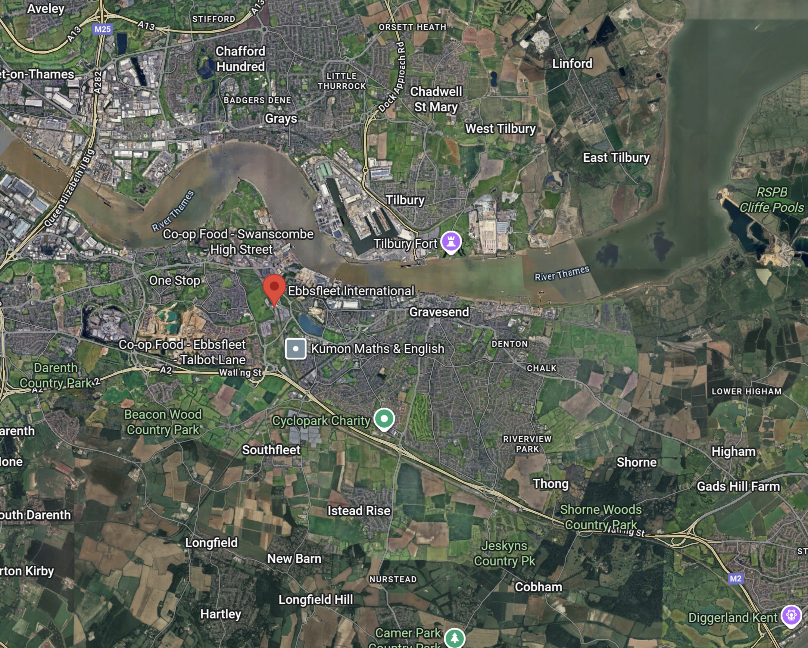 - Ebbsfleet International station at the bottom of the map.