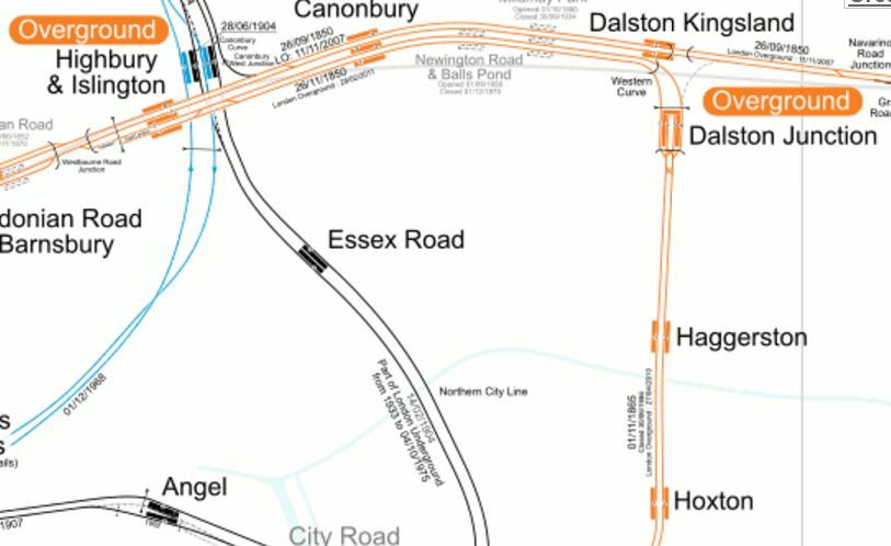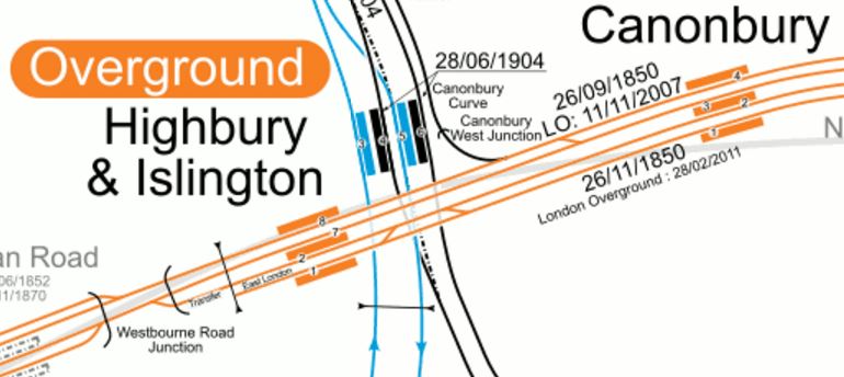 Note the Canonbury Curve in the map, which lies on a single-track electrified line that links the North London Line to Finsbury Park on the East Coast Main Line, Thameslink and the Northern City Line.