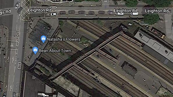 Note the footbridge over the station leading over the National Rail station to the Underground station marked by the red logo.