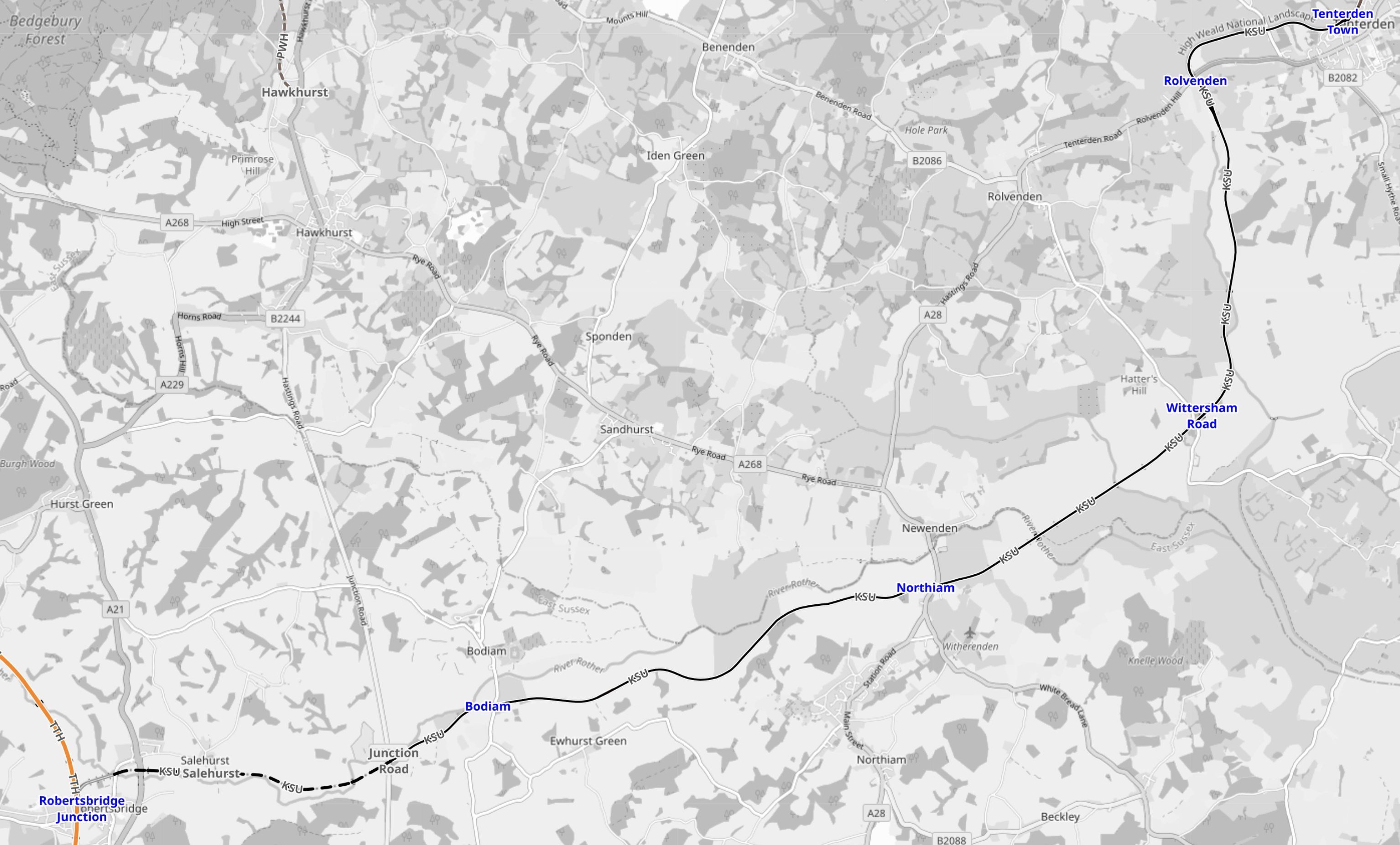 This OpenRailwayMap shows the route of the railway between Robertsbridge and Tenterden Town.