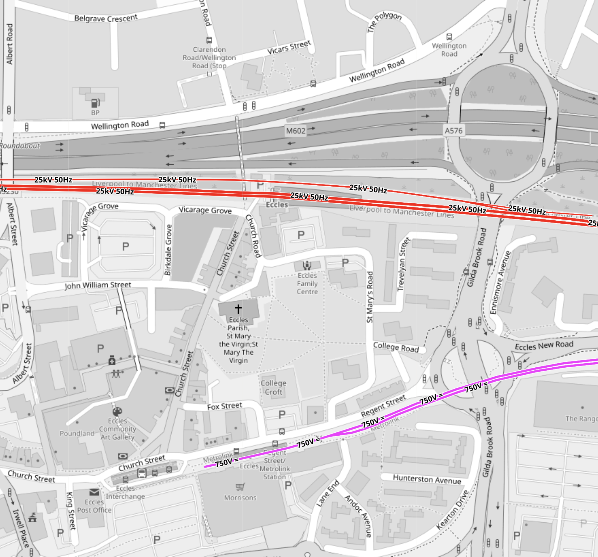 - The mauve tracks are the Manchester Metrolink.