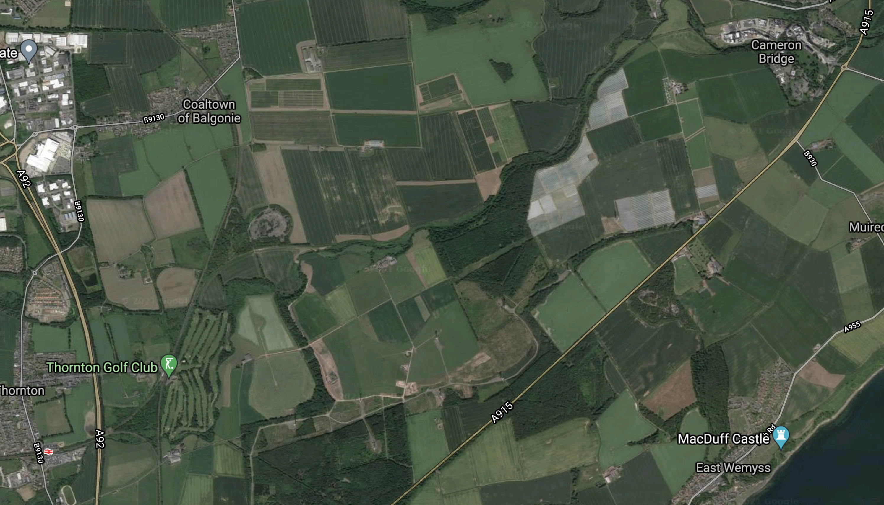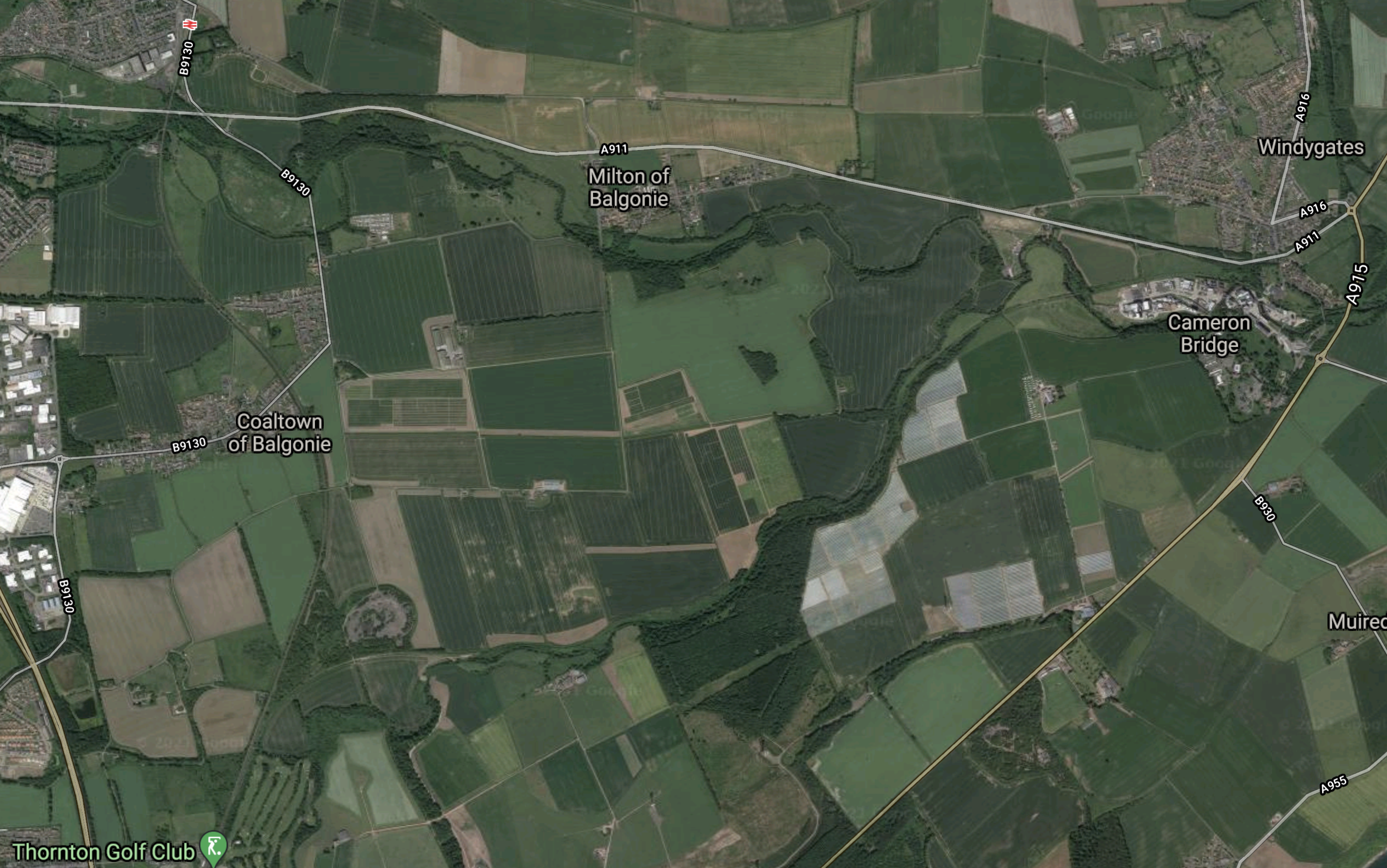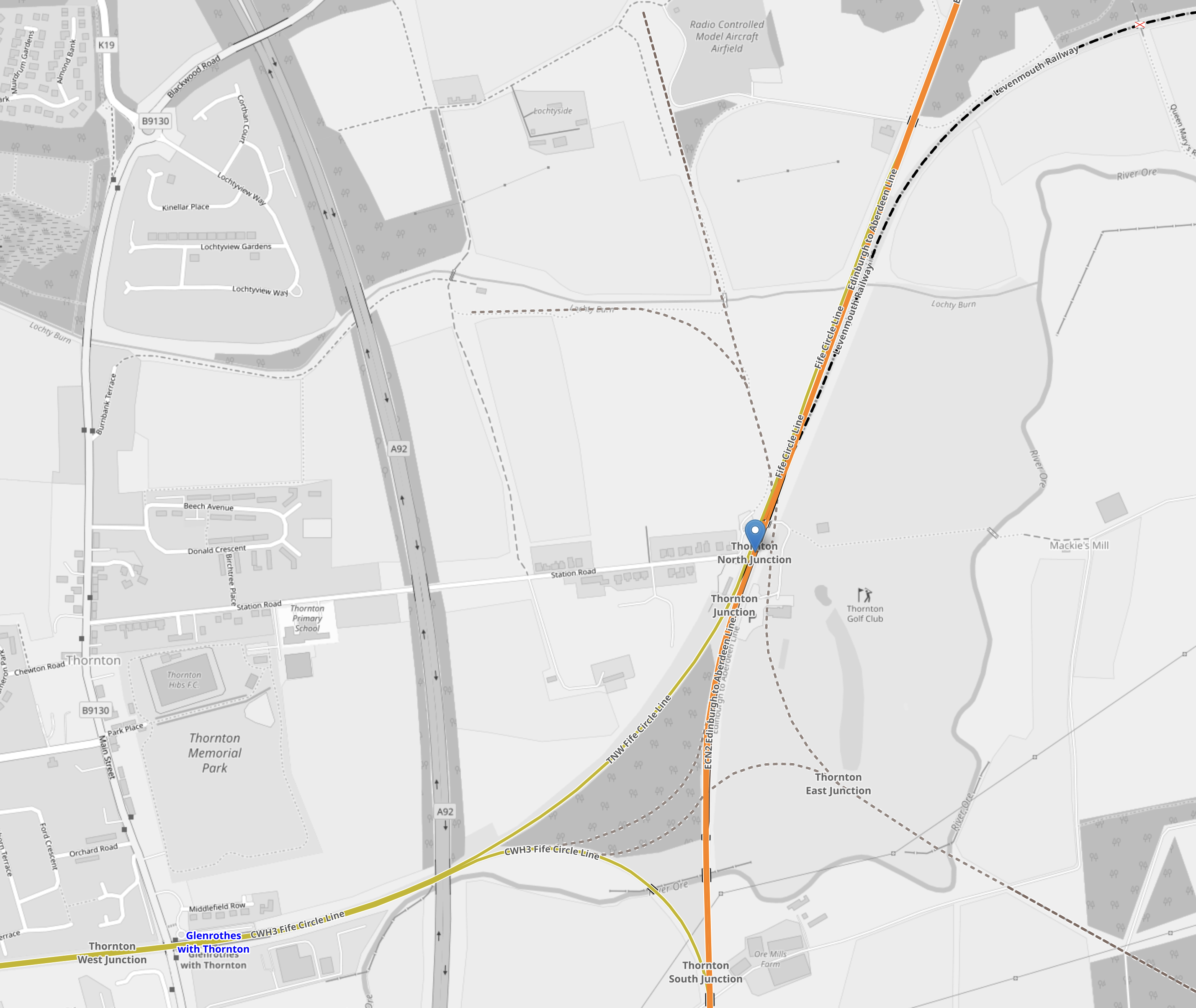 This second Google Map shows the main Edinburgh and Dundee rail line between Thornton Golf Club (Thornton North junction) and Markinch station, which is the next station to the North.