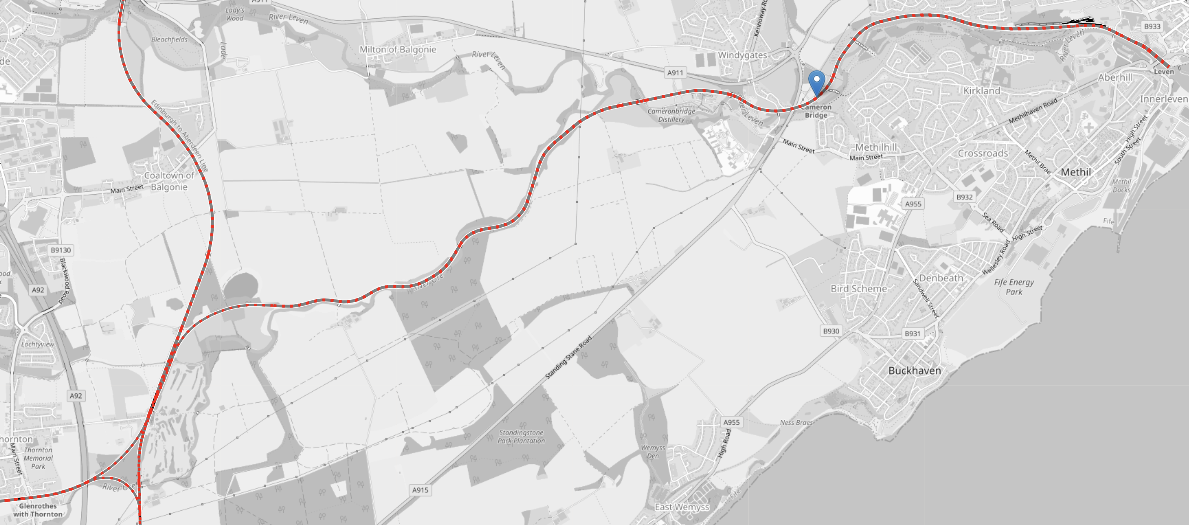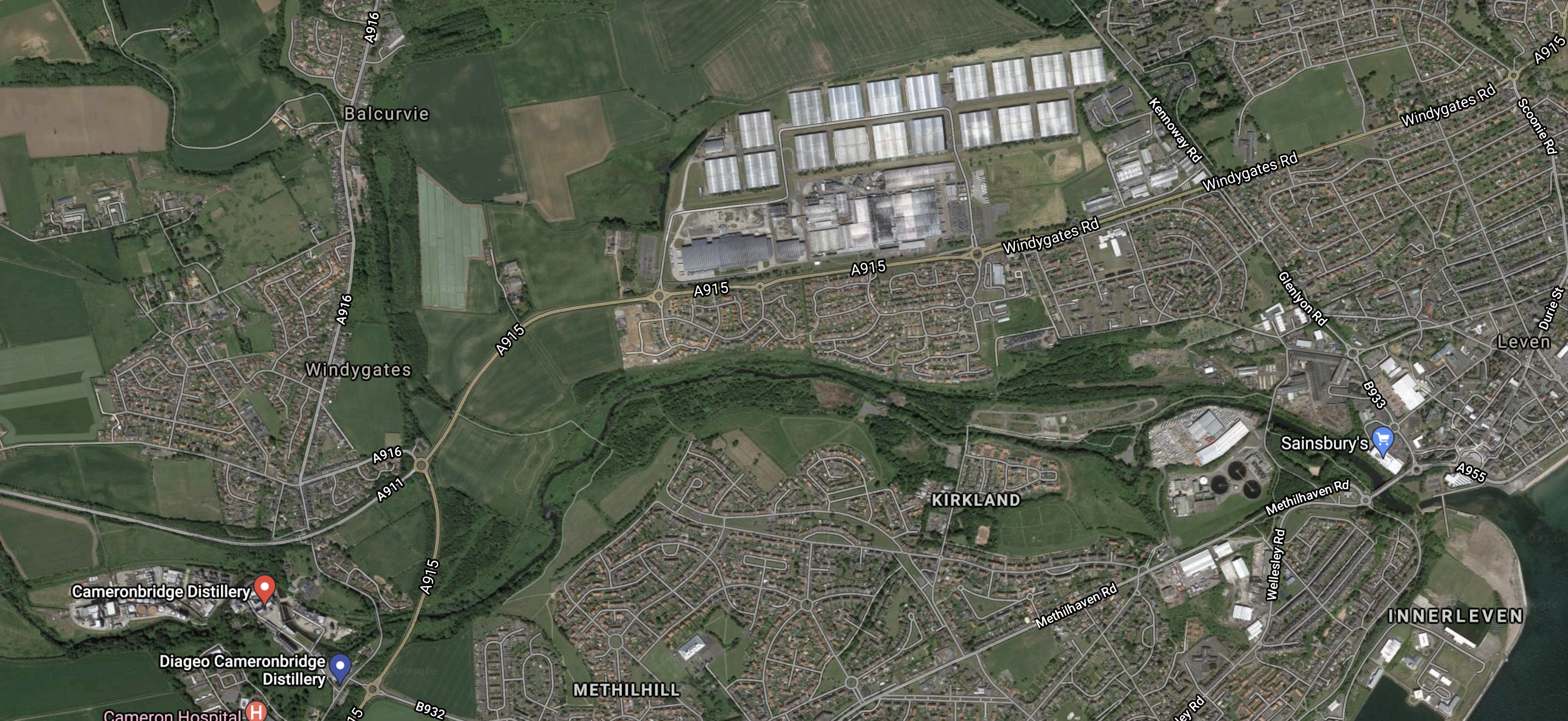 - The A 915 running diagonally across the map and to the East of the village of Cameron Bridge.