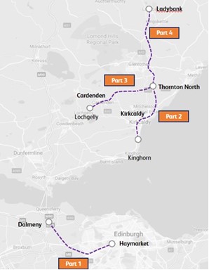The £55 million first phase, to electrify 65 miles (104 km) of Fife Circle track, between Haymarket and Dalmeny, for use by battery electric multiple units, was begun by Scottish Powerlines in June 2022 and is due to be completed by December 2024, although this project has been delayed and is expected to completed by December 2025. Further phases will electrify the lines between Kinghorn, Thornton, Ladybank and Lochgelly. This will allow the Fife Circle services to be operated by battery electric multiple units whilst minimising capital expenditure on infrastructure, in particular avoiding the major expense of electrifying the Forth Bridge. Complete electrification would be possible at some future date. The partial electrification was due to be completed by December 2025 but there has been some slippage in these target dates.