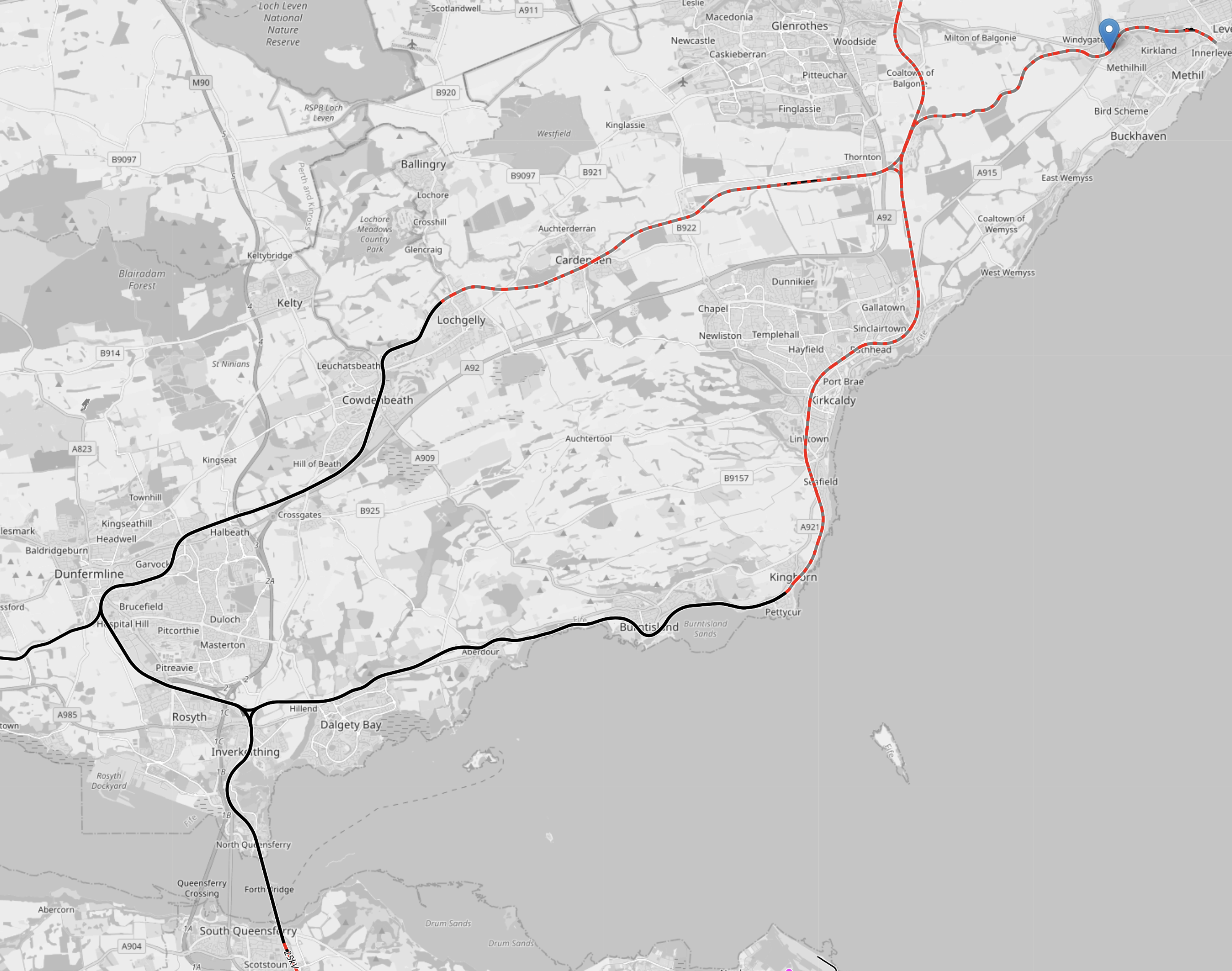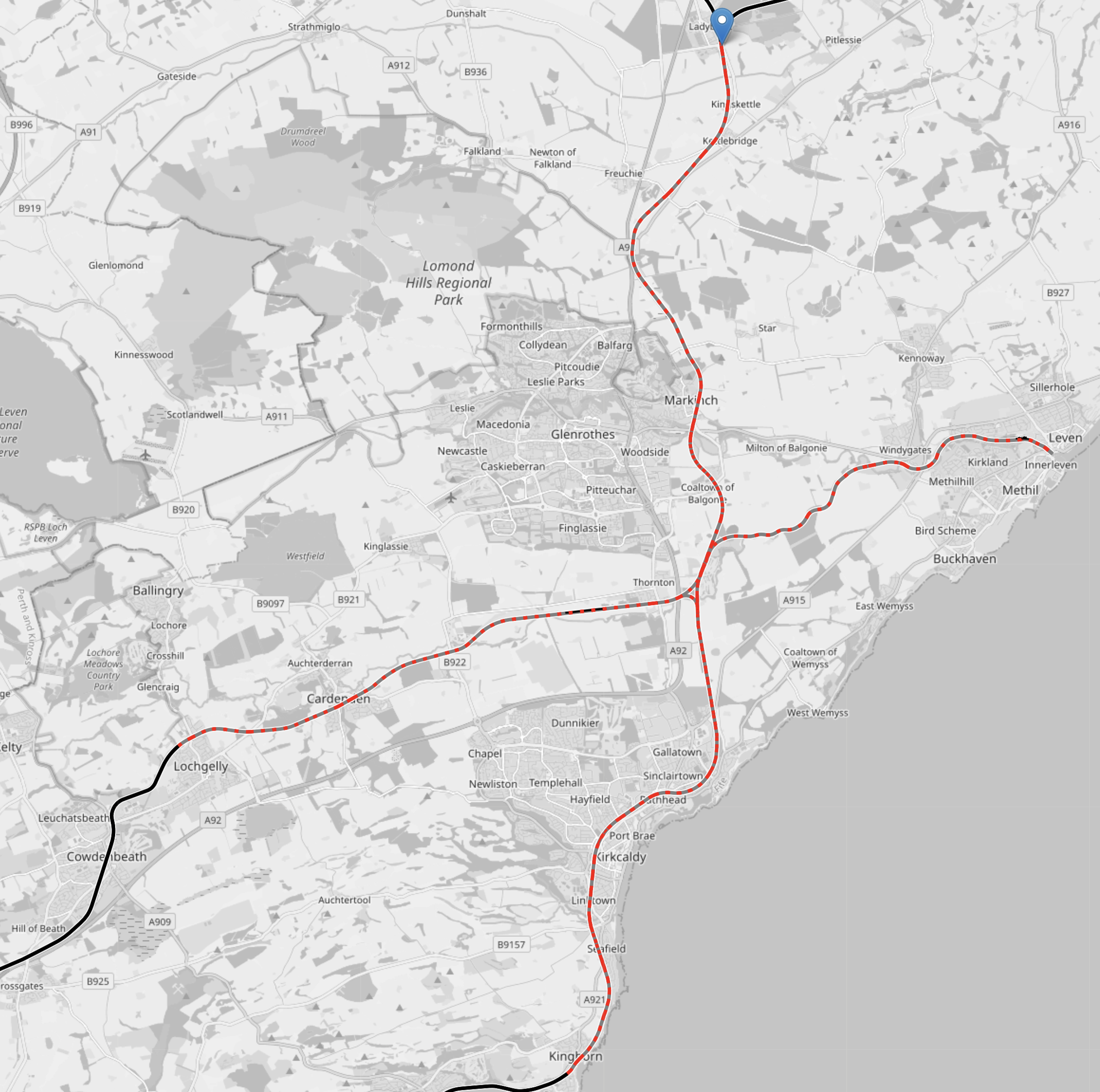 This OpenRailwayMap shows Kinghorn, Thornton, Ladybank and Lochgelly.
