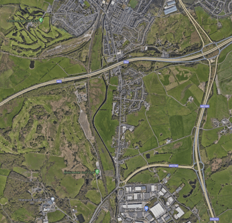 - The Calder Valley Line runs North-South and passes over the motorway.