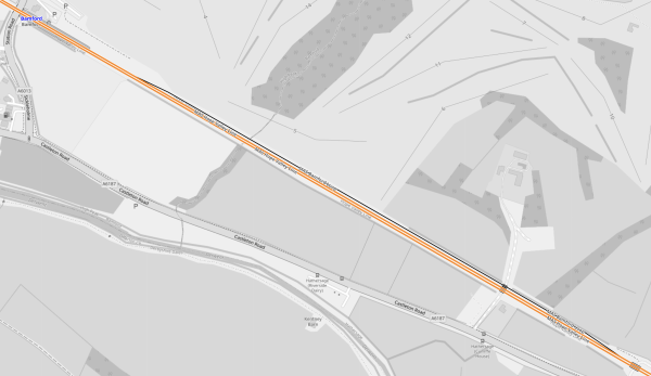 - The pink track in the South-West corner of the map is the Manchester Metrolink branch to Ashton-under-Lyme.
