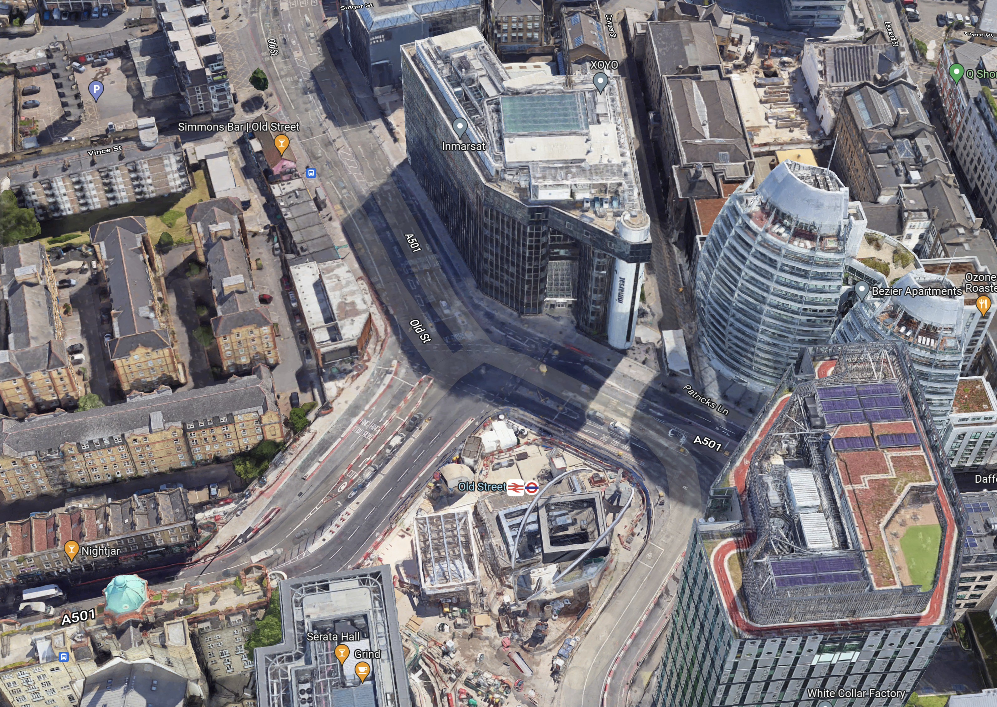 This Google Map shows the current state of Old Street Roundabout and the front of the Inmarsat Headquarters.