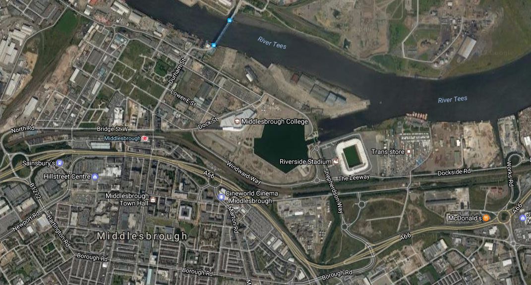 Note the railway passing through the town with the Grade II Listed Middlesbrough station to the North of the town centre.