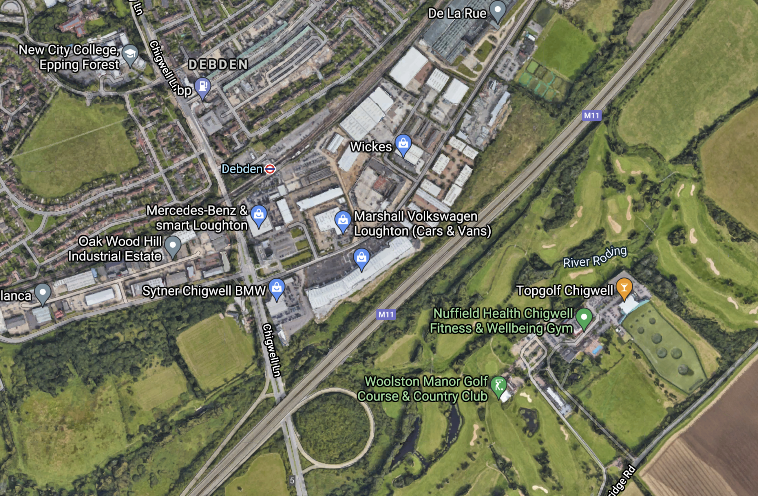 Note the closeness of the M11 to Debden station.