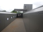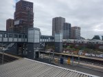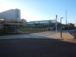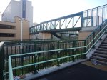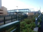 - A level walkway runs between the new station building and the footbridge.