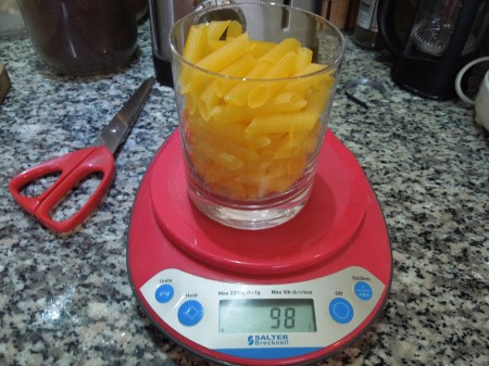 I haven’t cooked any pasta since I moved here nearly two years ago. But after Saturday’s Times published a list of pasta dishes saying they were the only ones you’d ever need, I thought I had better. Getting the amount of pasta correct has always been a problem and today, I decided that I had better do it by volume. So i carefully weighed out the 100 grams I need for myself of Dove’s Farm gluten-free penne.