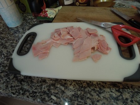 The ham was actually one 180g bubble of Waitrose’s honey roast ham. I just tore it into smaller pieces. I had put a saucepan on to boil.