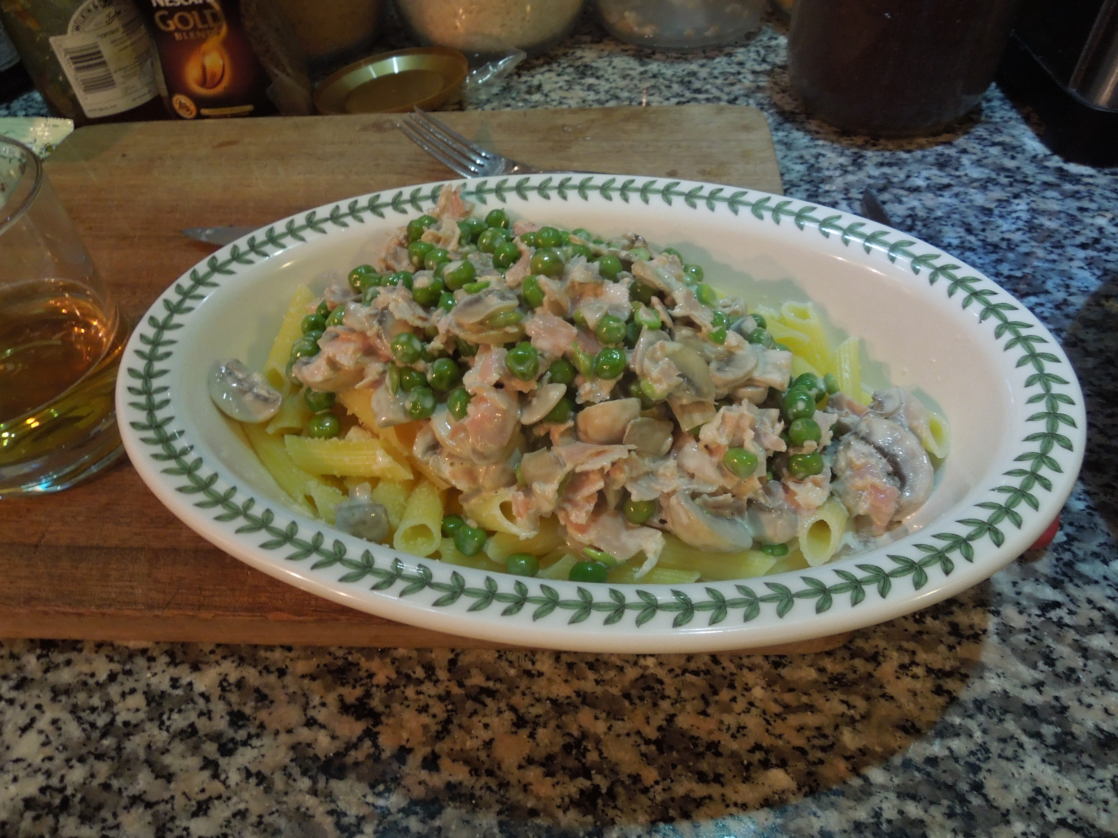 When it was boiling hard, I threw in a tumbler of Carluccio’s gluten-free pasta, which cooks in eight minutes. After five minutes, I threw half a cup of peas, which can be frozen or fresh. Obviously, for more people you add more pasta and peas.