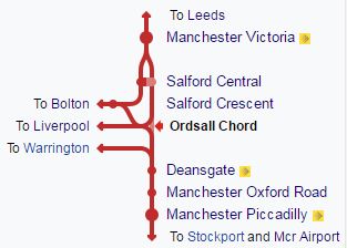 After the current works on the Ordsall Chord has been completed, Manchester Victoria, Manchester Piccadilly and Salford Crescent stations will form a triangle of lines and stations, through which services passing through Manchester will travel. This map from Wikipedia shows the lines in a simplified form.