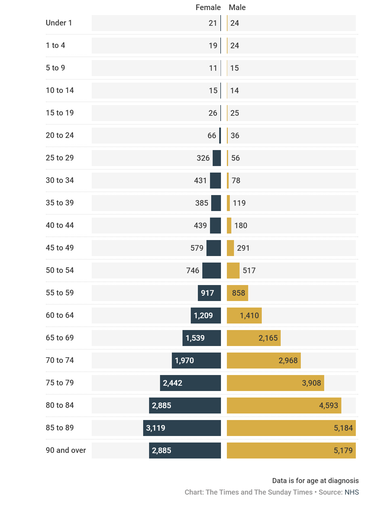 It shows the cancer incidence rate (per 100,000 population) in 2020 by gender and age at diagnosis.