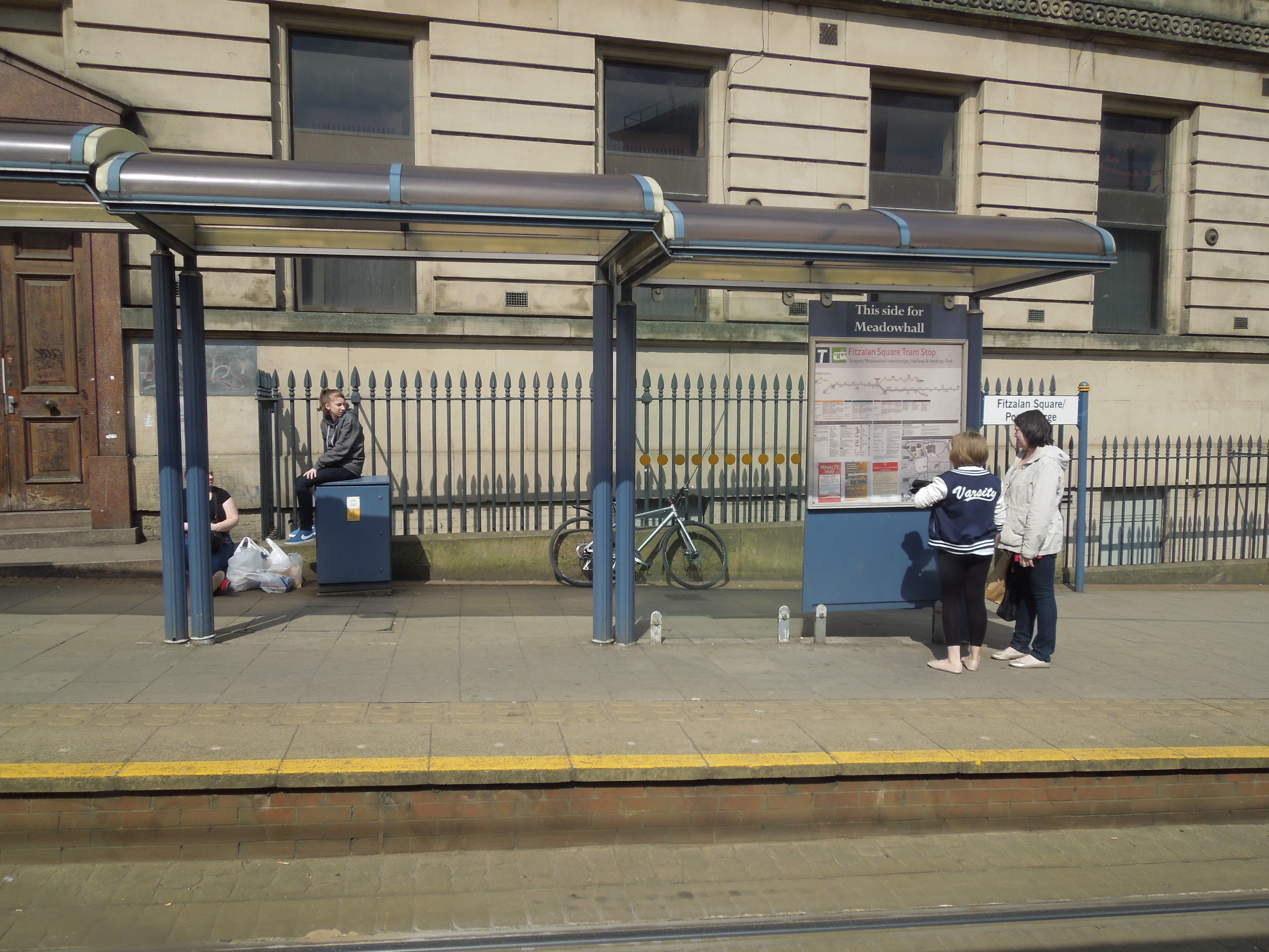 On my trip to Hillsborough, I didn’t see any seats at stops at all. Here’s the stop at Fitzalan Square.