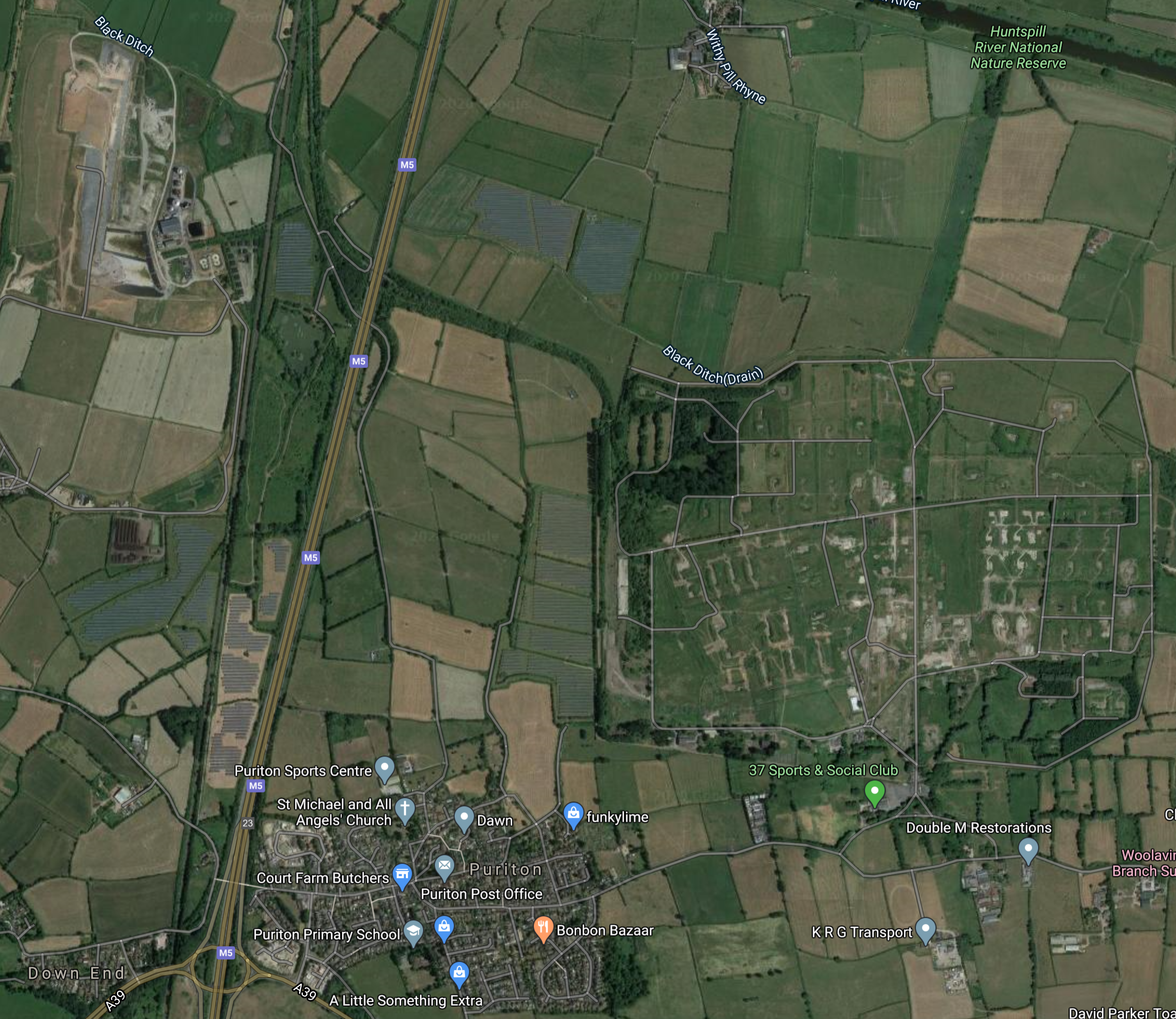 - The village of Puriton to the East of the Junction 23 of the M5, which is a forest of blue dots.