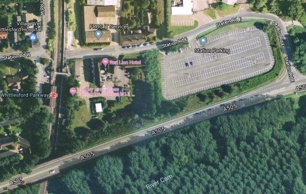 Whittlesford Parkway station has a Holiday Inn hotel and a large car park, as this Google Map shows.